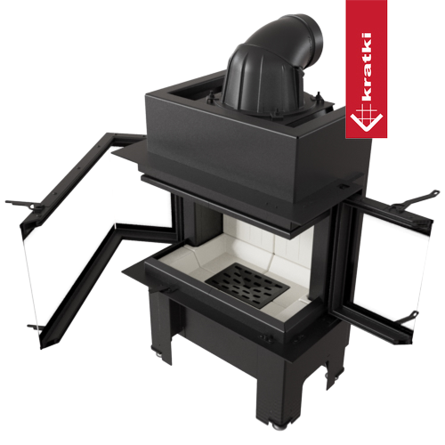 Doppeltes Türöffnungssystem nach oben (GILOTYNA) und zur Seite. Das Anheben und Absenken der Tür erleichtert das Laden der Holzmenge und der Mechanismus, der das seitliche Öffnen ermöglicht, erlaubt eine effizientere Reinigung des Glases.