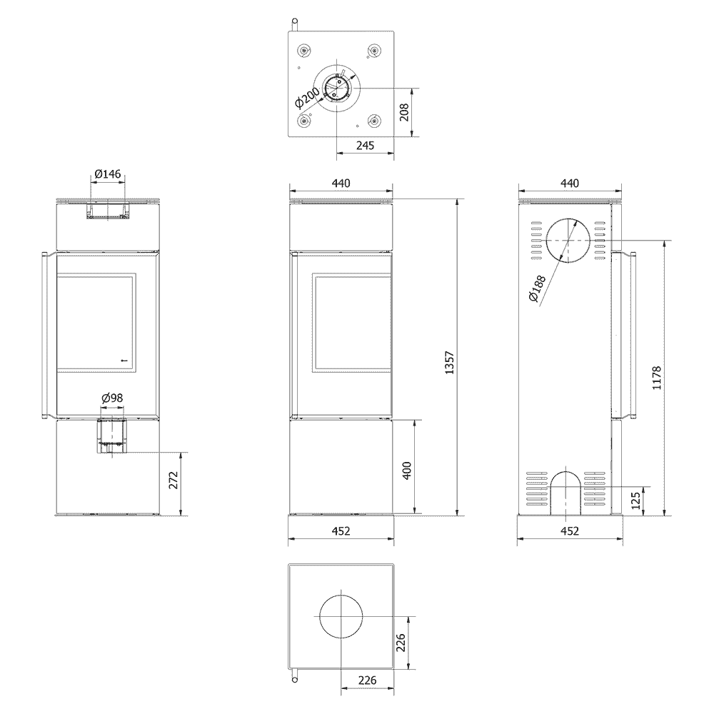 - Möglichkeit, den Rauchabzug sowohl von oben als auch von der Rückseite des Ofens zu installieren,